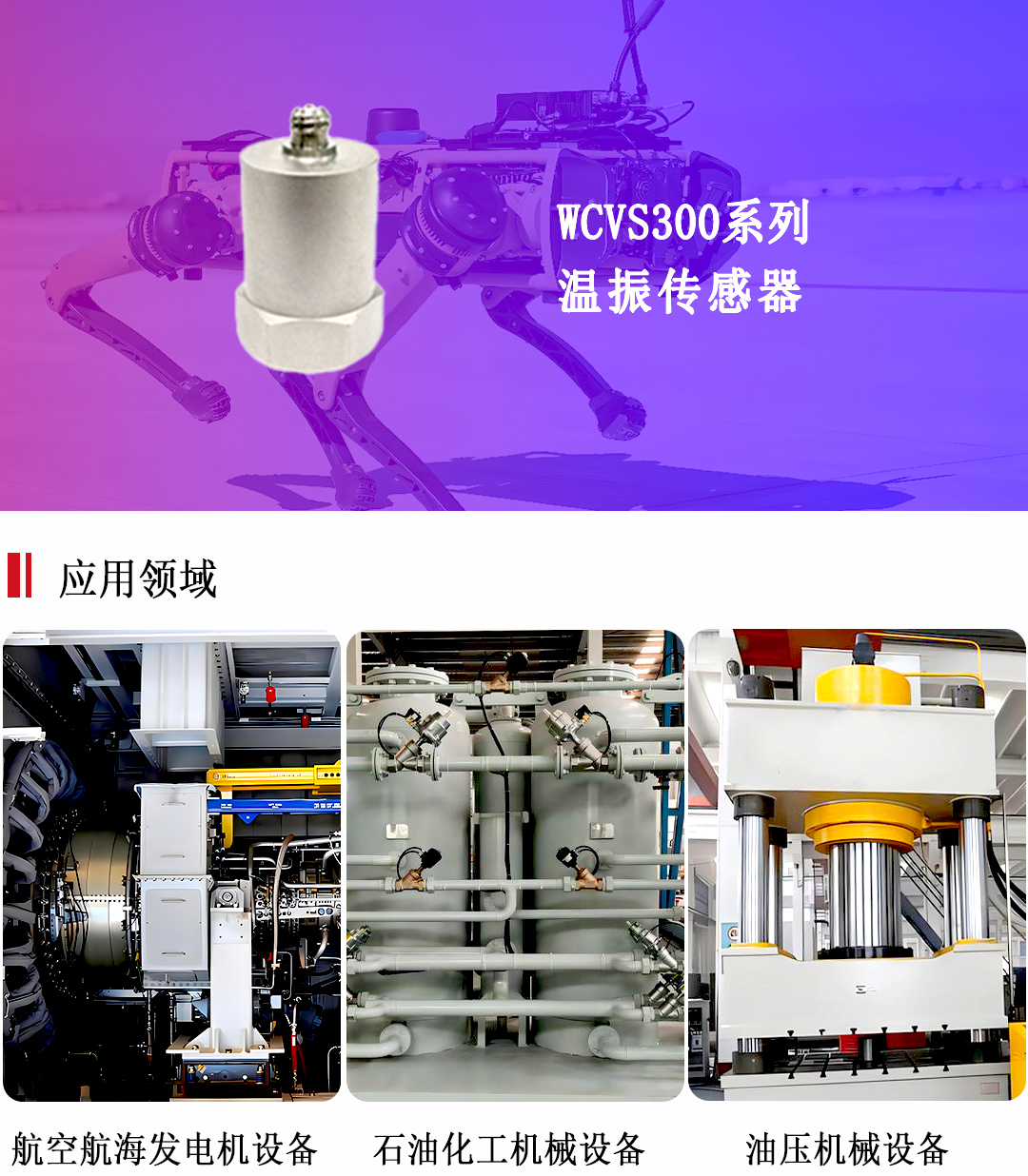 WCVS300系列溫振傳感器加速度測量范圍為0~10g(20g/50g可選),其精度為1%;溫度測量范圍為-40~105℃,其精度為0.1℃。它在航空航海、石油化工等旋轉(zhuǎn)機(jī)械(電動機(jī)、齒輪箱軸承、泵、離心機(jī)、壓縮機(jī)、空壓機(jī)等)齒輪、軸承震動故障分析等廣泛應(yīng)用。